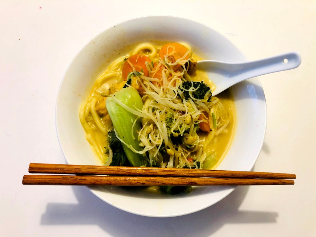 Laksa is the ultimate comfort food and an absolute winter favourite. This vegan version is part soup, part noodles, laced with crunchy vegetables and yummy protein, it is spicy, slurpy, tasty and satisfying. Serve with chopsticks. a chinese soup spoon and a wedge of lemon. I hope you enjoy making, sharing and eating this Laksa with your family and friends!